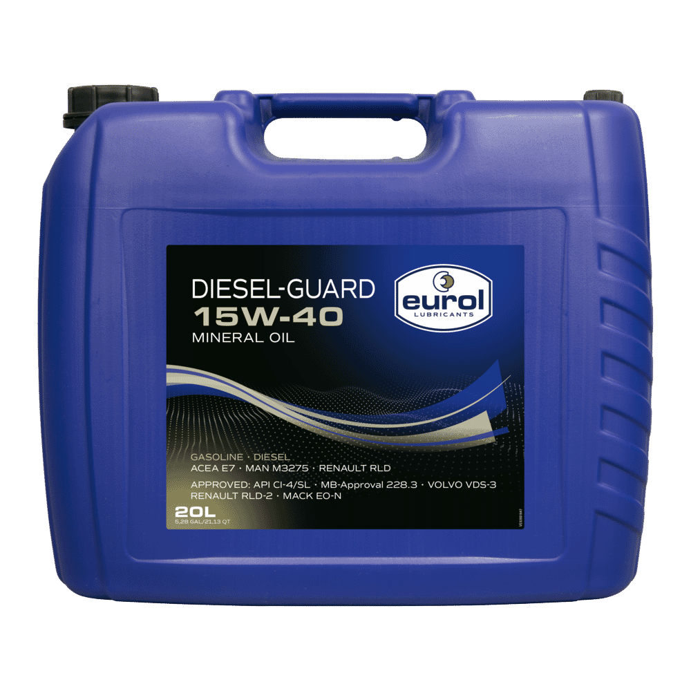 Eurol Diesel Guard 15W-40 is a modern engine oil suitable for heavily loaded diesel engines with or without turbochargers and off-road equipment. Eurol Diesel-Guard 15W-40 amply fulfils the latest strict norms regarding deposits on the piston crown and on the rest of the piston. Due to the high temperature and ageing stability and because of the presence of strong deterging additives, Eurol Diesel-Guard 15W-40 ensures both the oil and the engine stay in good condition. Wear is limited to a minimum, even under the most severe working conditions, so the quality of Eurol Diesel-Guard 15W-40 is guaranteed during the full drain interval regardless the type of engine and working conditions. Eurol Diesel-Guard 15W-40 can be used for application in Euro II, Euro III and Euro IV and some Euro V engines, when fuels with high sulphur contents are involved. Eurol Diesel-Guard 15W-40 is not recommended for diesel vehicles with a Diesel Particulate Filter. Eurol Diesel-Guard 15W-40 is also recommended in gasoline engines, where SAE 15W-40 with API SL is prescribed.