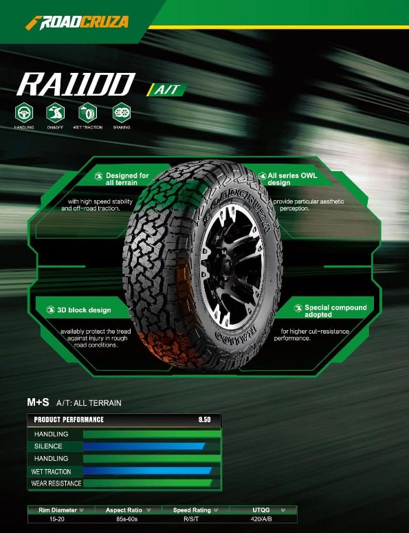 ROADCRUZA AT RA1100″ you mentioned is an all-terrain tire. Let’s break down the specifications:
