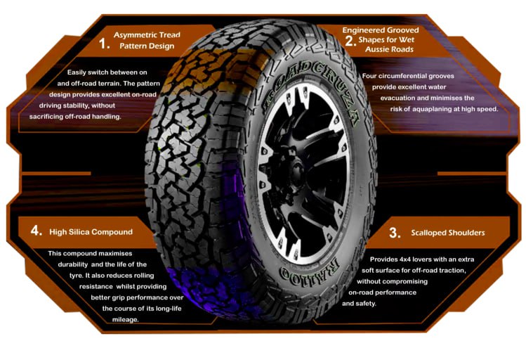 This tire is suited for adventurous drives, allowing you to explore various terrains with confidence. Its rugged tread pattern and durable construction contribute to enhanced performance, grip, and durability. Whether you’re cruising on highways or venturing off-road, the ROADCRUZA AT RA1100 aims to deliver a balance between comfort and off-road capability.