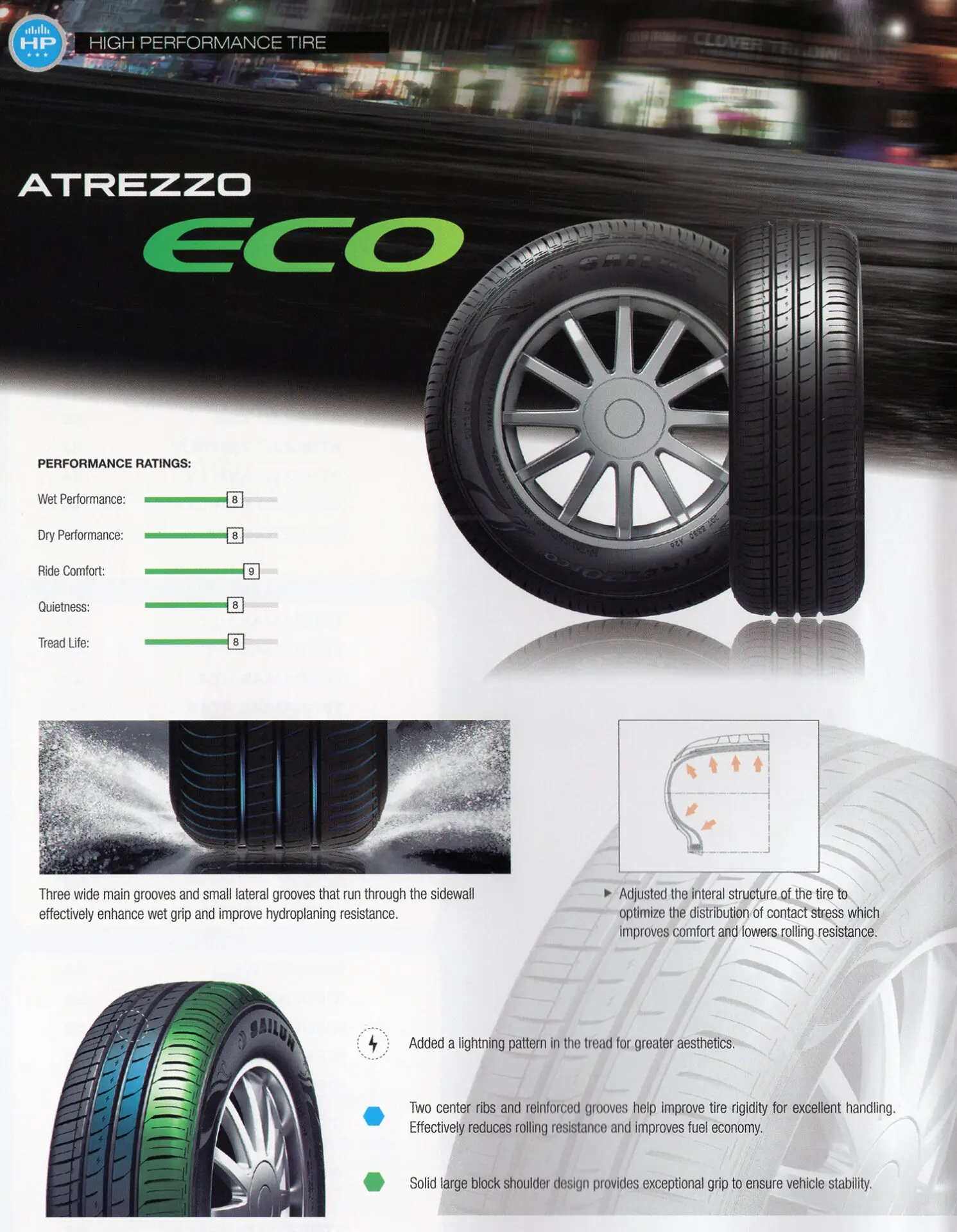 – Latest Silica tread compound for reduced fuel consumption and noise emission.