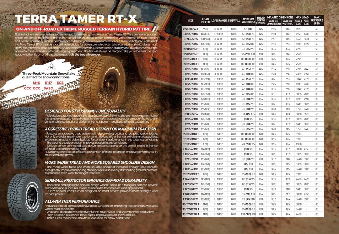 • Type: Rugged Terrain (RT-X), a hybrid tire combining the best features of all-terrain and mud-terrain tires.
